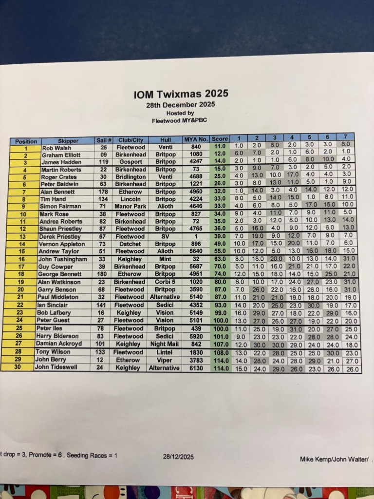 After about 4 heats the wind strength reduced so some skippers changed their rigs to top suits of sails. After 6 heats the light was fading so just important resails were taken so that a race winner could be decided. As some skippers had not had a bye, results were given as % of possible points sailed for.