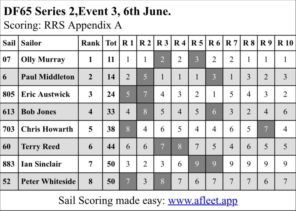The DF95s were well turned out tonight with a dozen yachts making it to the water. Overall, Mark dominated the evening session with some comfortable victories, but was pushed hard by Olly and the others in glorious sailing conditions. Ian edging Paul to third.