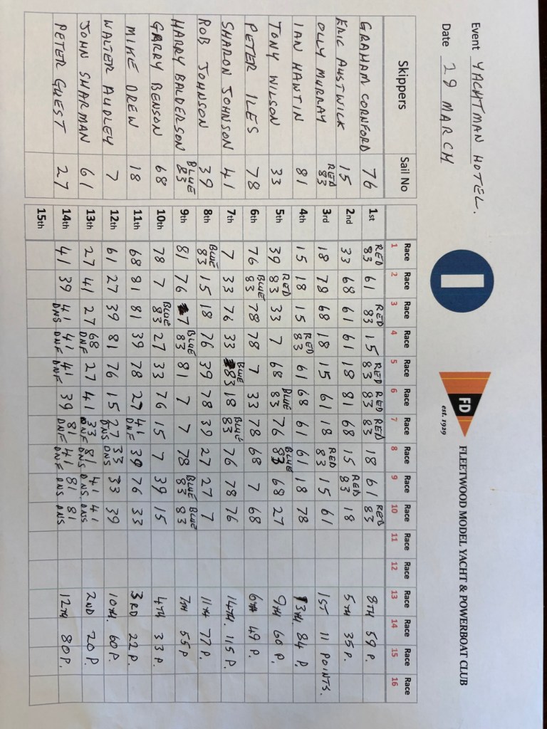 IOM Sailing 29/03 Posted on 08/04/2025 by David Rose A good turnout of 14 boats with quite a few away When done Olly, John and Mike Drew making up the podium Share this: Click to share on X (Opens in new window) X Click to share on Facebook (Opens in new window) Facebook More Click to print (Opens in new window) Print Click to email a link to a friend (Opens in new window) Email Like Loading...