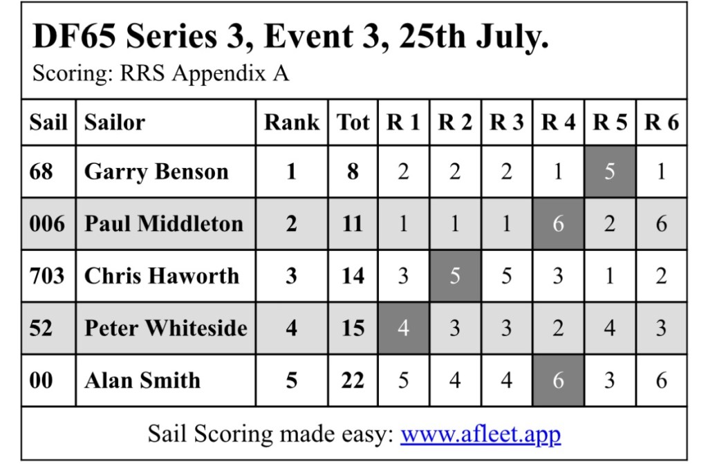 Again Olly and Paul having a tussle at the front of the fleet leading to equal points in both races. Both sharing the honours after countback.