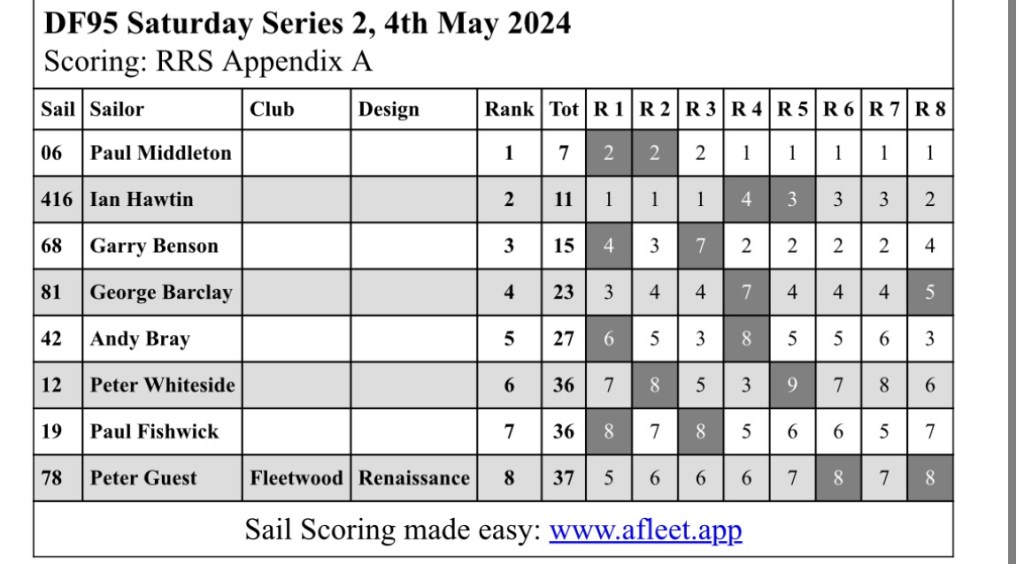 On both days the wind was extremely light from the North at race commencement, then gradually increasing in strength blowing from the N West, giving ideal top suit sailing conditions, with most skippers starting to use spinnakers.