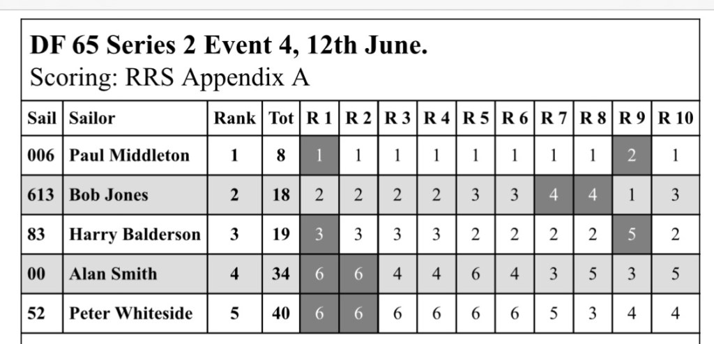 Beats and runs were sailed in heat 1, then for the safety of boats and skippers, it was agreed to sail beats only, as yachts were coming downwind very fast for the capabilities of the competitors present. Two rounds were sailed.